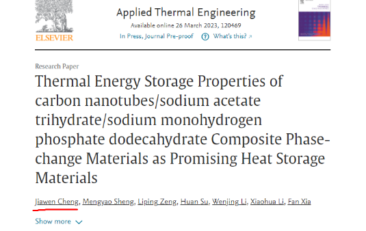 近日,建筑工程学院研究生程家文的研究成果《Thermal Energy Storage Properties of HCNTs-CH3COONa·3H2O/Na2HPO4·12H2O Composite PCMs as Promising Heat Storage Materials》被《APPLIED THERMAL ENGINEERING》(ATE)期刊录用。ATE作为中国科学院分区二区的期刊,2022年的影响因子为6.465,是工程技术领域的能源与燃料方向期刊,在热力学、机械工程和力学领域均为一区。